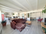 L’habitation principale de 143 m² se situe au 1er étage et s’ouvre sur une vaste entrée avec placard, menant à une pièce de vie lumineuse de 45 m² avec un espace séjour, un coin bibliothèque et une cuisine ouverte aménagée.